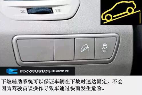 下坡辅助系统是近年来比较流行的电子辅助设备,它可以使车辆以固定的速度行驶,车辆会自动控制发动机转速及刹车,以免车辆在下坡过程中由于驾驶员的失误或错误操作,导致车辆车速过快造成事故。由于下坡辅助系统是电子设备强行介入行车,请勿在开启下坡辅助系统下大力轰踩油门,以免对发动机及变速箱造成损坏