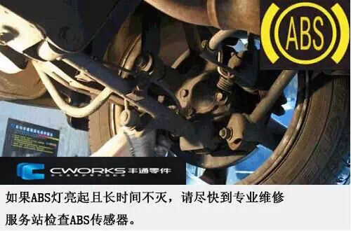 ABS是保证我们车辆在紧急制动时能够安全停下的必要辅助设备,如果ABS灯亮起,请尽快到维修店检查各传感器是否有干扰或传感器是否完好,以免发生紧急制动时ABS不能正常启动,车辆发生轮胎抱死侧滑情况出现。