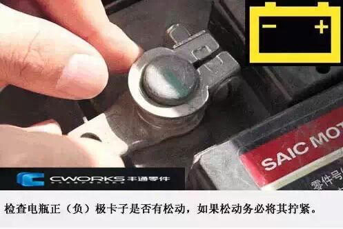 如果车辆在怠速或行驶过程中出现电瓶灯亮起的情况应进行如下处理:先将车辆停下(不要熄火),检查电瓶卡子是否卡牢,如不牢固请将其拧紧,此时如果电瓶灯熄灭则无碍;如果电瓶灯未熄灭,应尽快到附近的维修店对发电机皮带及发电机进行检查,看看其工作状态是否正常(如不及时处理你很有可能就要推车回家了)。