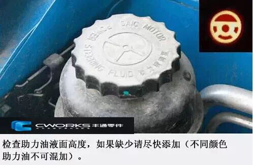 现在大部分车辆仍然使用液压助力系统,这就需要我们经常检查助力油是否有缺损,如果发现助力油灯亮起,请尽快补充助力油,以免损坏助力泵及转向系统。