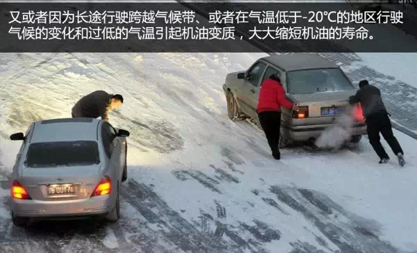又例如因为长途行驶导致的跨越气候带、或者在气温低于-20℃的地区行驶;气候的急剧变化、过低的温度都会引起机油的变质,从而大大缩短机油的“寿命”。像以上两种情况,我们同样建议把机油更换里程缩短20-30%。