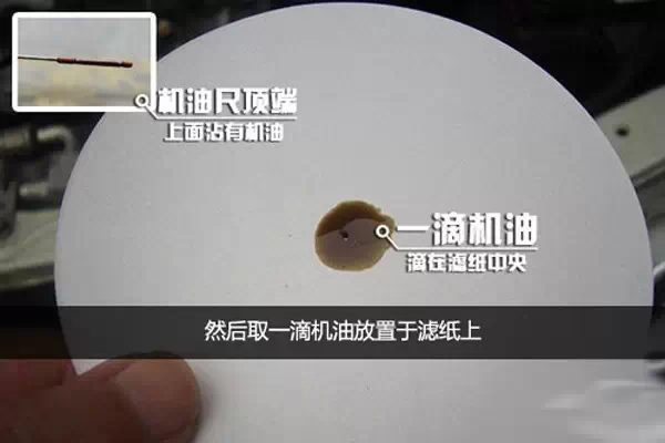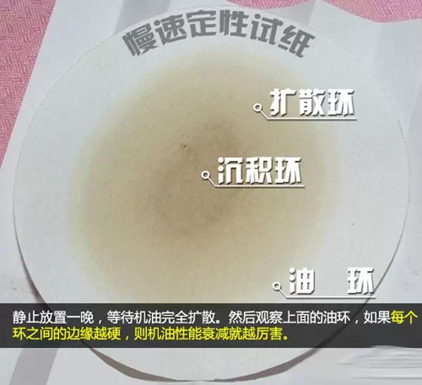 通过机油尺中取出少量机油滴在机油试纸上,然后静止放置一个晚上,等待上面的机油在试纸上完全扩散。如果扩散的机油油环、沉淀环、扩散环之间的边缘越硬,则机油性能衰减就越厉害。我们曾经有同事写过一篇文章,有兴趣的朋友可以点击阅读:《1毛钱测试机油质量》。