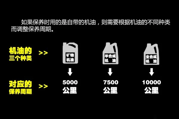 如果保养是更换的是自己购买的机油,那就要根据机油的不同种类来区分更换周期。之前的机油文章就写过,机油分为矿物油、半合成油、全合成油三类,这三类机油的更换周期也各不相同。