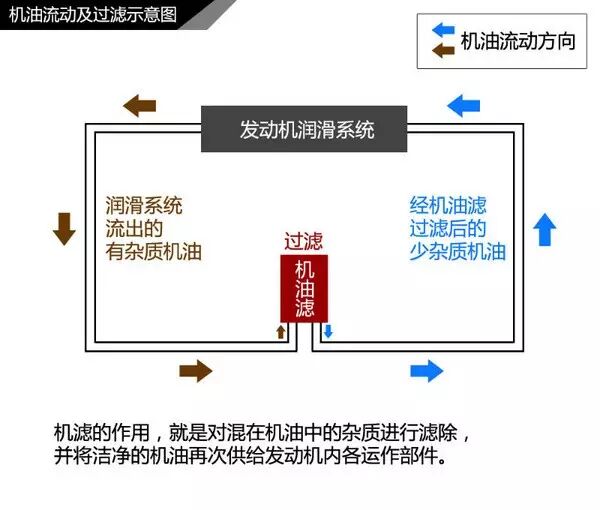 机油在发动机内流动,在润滑机件的同时,还会将附着在机件表面的杂质洗下来。洗下来的杂质在机油清洁因子的作用下悬浮在机油中,随机油流动。在流经机滤时,较大的杂质就会被过滤掉,过滤后的干净机油又会重新进入到润滑系统中循环。文字解释多少有些抽象,下面这张示意图就简单直观多了: